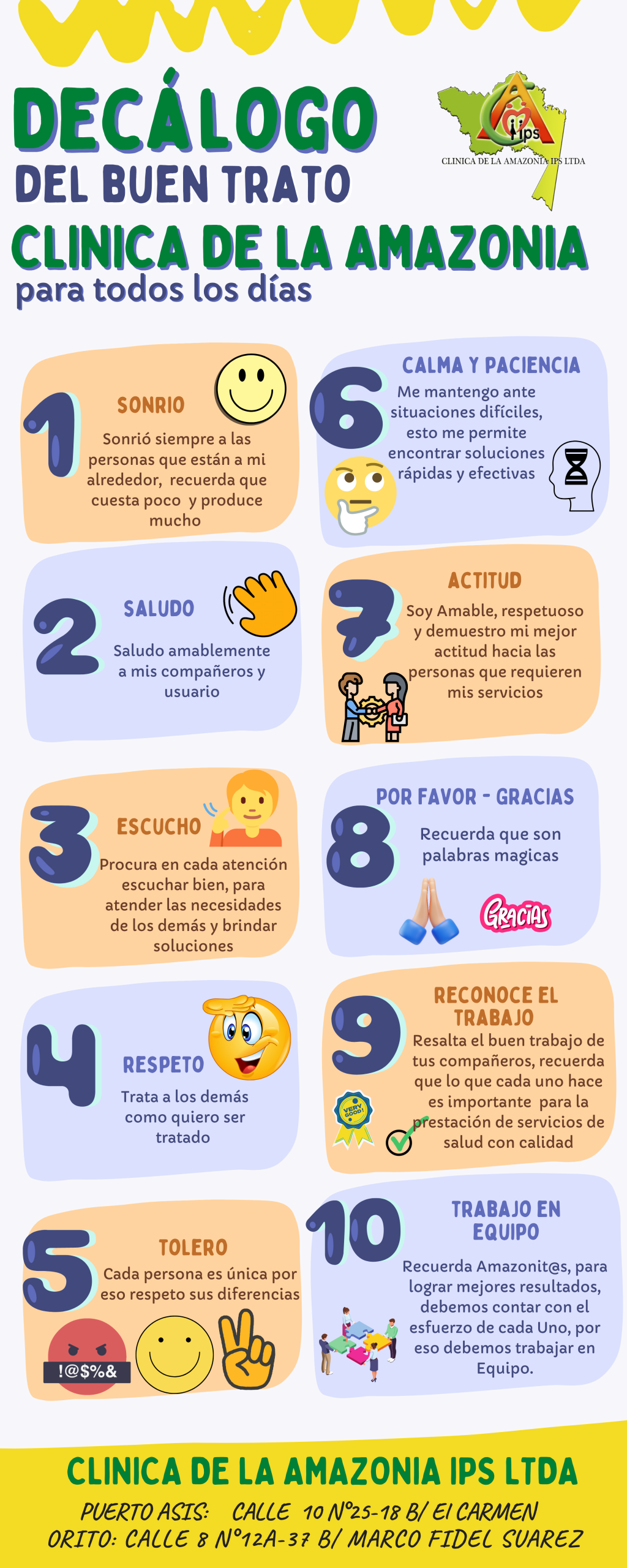 “Decálogo del Buen Trato – Clínica de la Amazonia IPS Ltda.”, una guía práctica para fomentar el respeto, la cordialidad y el trabajo en equipo en nuestro entorno laboral y en la atención a nuestros usuarios.